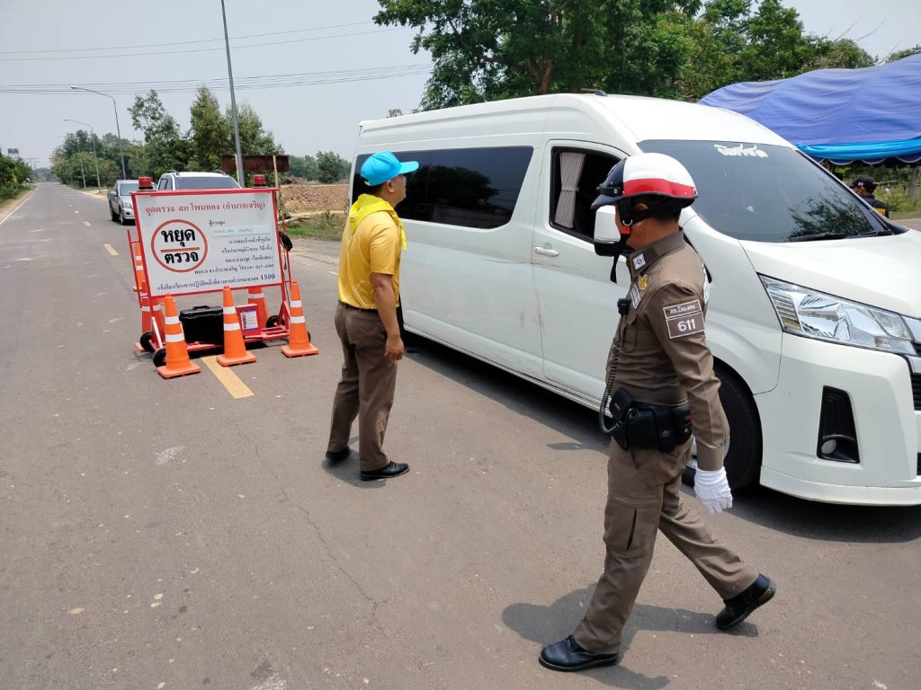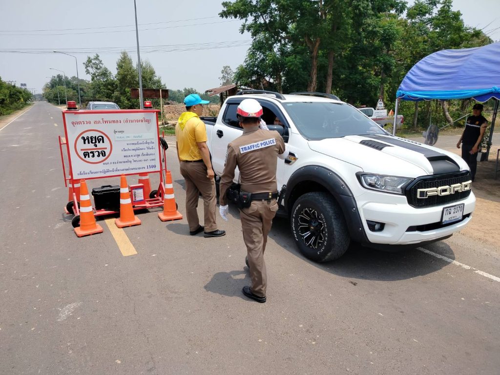 จุดตรวจ/จุดบริการประชาชน หน้าสภ.โพนทอง เจ้าหน้าที่ตำรวจ ตำรวจจิตอาสา ฝ่ายปกครอง อสม. เรียกตรวจและบริการน้ำดื่มให้แก่ผู้สัญจรไปมาบนถนนช่วงเทศกาลสงกรานต์2567 การจราจรเบาบาง เหตุการณ์ทั่วไปปกติ